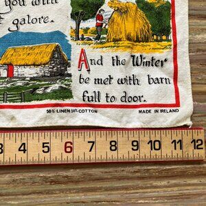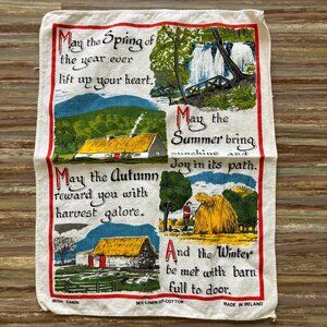 Vintage Kitchen towel has printed Irish countryside designs with season blessings: "May the Spring of the year ever lift up your heart. May the Summer bring sunshine and Joy in its path. May the Autumn reward you with harvest galore. And the Winter to be met with barn full to door." Approx. 12" x 15 1/2". 50% cotton/50% linen, made in Ireland. Pre-owned condition: has a few spots/discolorations to fabric from use, corner edges are fraying. See photos.