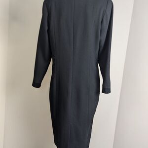 Elegant vintage wool little black dress by Irving Samuel, featuring a classic sheath silhouette with no stretch. Inspired by Chanel, this timeless piece has long sleeves, gold button details, and a modest yet stunning design. Slit at the back for ease of movement.