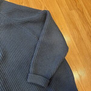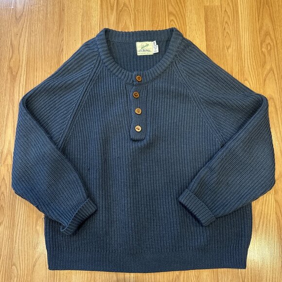 Vintage Islander heavyweight knit Henley sweater in deep blue. Made in Canada with a chunky ribbed knit, raglan sleeves, and four-button Henley placket with contrasting buttons. Classic heritage / workwear style with a relaxed, substantial feel. Older Islander label (Direct Merchants, Halifax N.S.), sought after for Canadian-made construction and durability. No modern sizing stretch—please compare measurements.