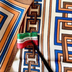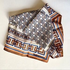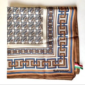 Jakymar vintage square scarf, made in Italy. Interlocking geometric pattern in shades of brown, orange, blue on white background.