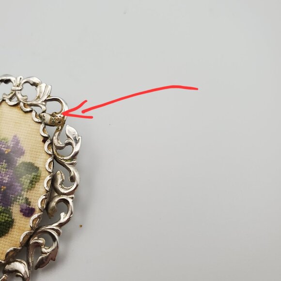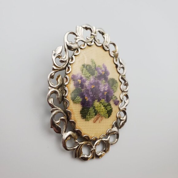 Vintage Italian Needlepoint Floral Pansies Ornate Silver Brooch Oval Leafy Bezel