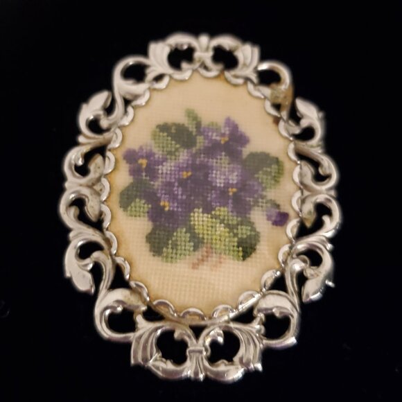 Collector's Jewellery Piece * Unique Needlepoint / Cross-stitch Floral Fabric Design * Purple Pansies * Ornate Silver Bezel