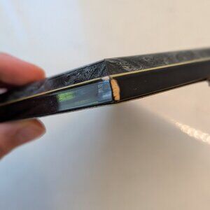 Likely gold leaf, silk screened and handpainted based on other pictures I have. I think the sticker with information fell off. Likely made in Italy.
