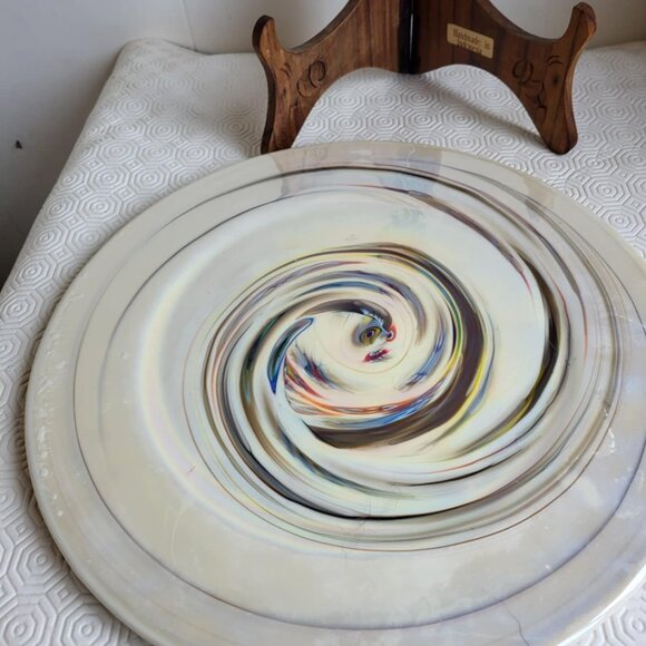 Vintage Italian Yalos Casa Murano Decorator Plate, Iridescent Pearlescent Milleflori Swirl ArtBeautiful 12" vintage signed (see last two pictures) Yalos Casa Murano Decorator plate. Some call this a charger plate, but no matter what you chose to call it, it is a beautiful piece to display. There are no two exactly the same as all are hand blown. This has not been washed in dishwasher ever (not good for any art glass). Murano Glass has always been highly collectible. I find the back as interesting as the face. Flowers, feathers, eyes...just a really lovely collectible piece.