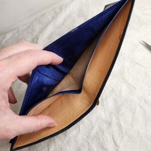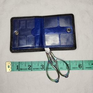 Vintage 1930s, Made in Italy, tan & blue inside, 1 card slot, 2 stamp slots, metal snap button, matching Antique 1920s little black leather stamp holder with plastic inserts.