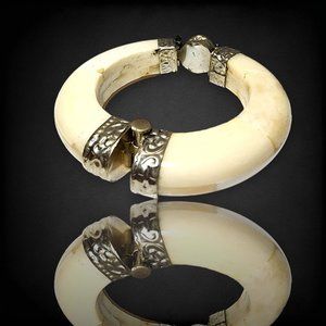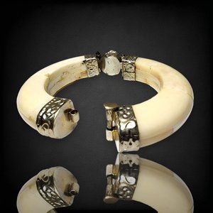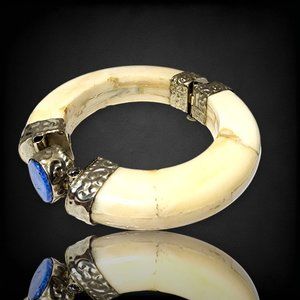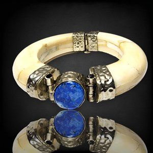 Vintage Ivory inlay Bone and Brass Hinged Bracelet, Lapis Lazuli Stone