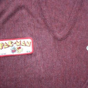 This is a vintage sweater, but it is in great condition. There is minor pilling/frizzing. There are no holes, stains, or damage. The Pac-Man patch is in perfect condition. The stitching on the reverse side was spot-glued on a few different areas to prevent detachment. As a result, it is 'hard to touch' in the glued areas.