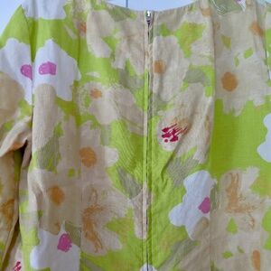 This is a J. Crew boat neck top in women's size 14. It features 3/4 slightly belled sleeves, back zipper, and is made of 100% linen. It is lightweight, breathable, and suitable for travel or casual wear. The print is particularly attractive in a sophisticated modern floral. The colours are acid green, light tan, white, orange and pinks.