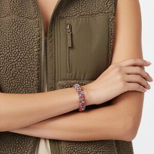 Add a pop of colour and texture to your wrist with this stylish braided bracelet from J.Crew. This bracelet features a unique design with a woven fabric braid in a beautiful multi-colour floral pattern (red, navy, and white). The braid is accented with gold-toned metal squares and sparkling clear rhinestones, adding a touch of glamour to a casual, bohemian look.