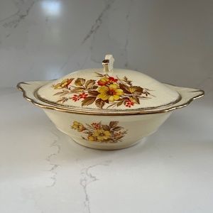 Sunshine pattern in beautiful fall colours for your Thanksgiving table! Four pieces include gravy boat, gravy stand, vegetable dish and matching lid. In great condition - no chips or cracks.