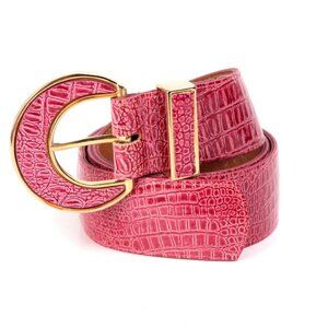 Beautiful leather belt with an embossed croc/reptile print and large half moon style buckle. Red with gold trim.