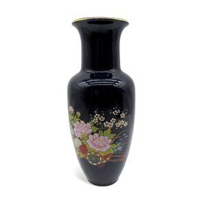Vintage JAPANESE Cobalt Blue Ceramic VASE with Flowers And Gold Accent 12" Tall