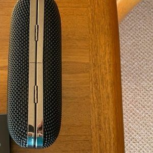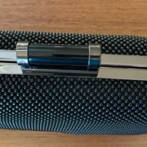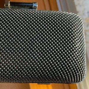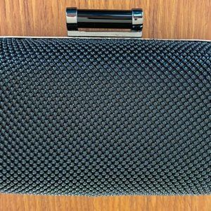 This hard-cased black metal mesh clutch has shiny chrome edging details, a cylindrical black and chrome top clasp, and a silver/black chain that can be tucked inside. The satiny black fabric lining and single interior pocket are in excellent condition, with no fading, stains, rips, tears, or holes. This evening bag is in almost-new condition and I don’t remember if it was ever used – please look at all photos as they are part of the description. Width 18.5 cm (7 ¼ in.); height including clasp 12.3 cm. (4 ¾ in.); depth 5.7 cm. (2 ¼ in.); each side of the chain is 58.5 cm. (23 in.) which is long enough for either shoulder or cross-body use when it is not tucked away. Not sure when it was bought but an identical one in silver is selling online as “vintage 1970/80’s minaudiere.” Pet-free smoke-free home.