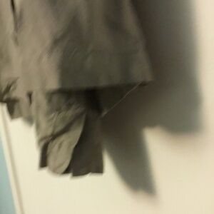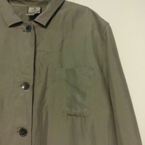 This could be a jacket or a blouse— a silk 80s jacket. Lightweight unlined silk, boxy fit, shoulder pads. Three patch pockets, button detail on sleeves. In excellent vintage condition…no flaws or stains. Top button is not a match for the rest, but it is close. Bottom pockets are still stitched shut. It looks green but more a neutral tan/ sand colour in person.