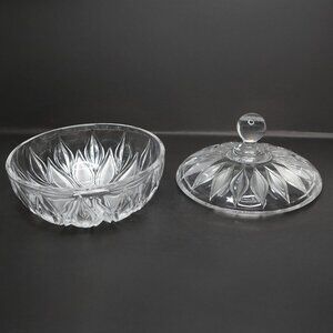 Crafted by the renowned Joska crystal house, this dish features deep, brilliant diamond-cut facets that capture and refract light beautifully, giving it that unmistakable sparkle that only high-quality lead crystal can provide. The most charming detail is the elegant frosted leaf design etched around the lower bowl, offering a beautiful contrast to the clear, polished crystal. The lid is topped with a faceted knob handle.