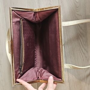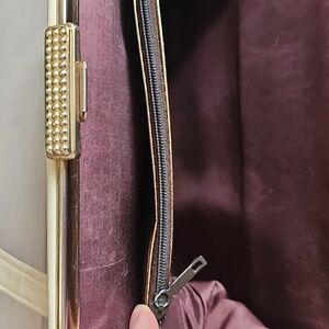 condition: the metal finish has patina chipping wear, as pictured. the exterior leather has some scratches and mild staining, as pictured