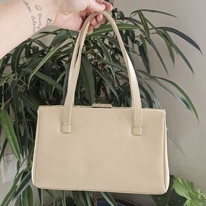 Vintage JR Canada White Leather Shoulder Hand Bag. Timeless, Mid Century Modern Vibes. sleek, structured silhouette and double top handles that comfortably fit over the shoulder, it’s the perfect blend of functionality and retro flair. The clean vertical seam lines and soft neutral tone make it ideal for styling with minimalist, coquette, or clean girl aesthetics. Fully lined interior with snap closure. has a zipper pouch, and 1 other pouch right behind it.