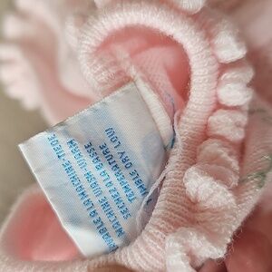 Vintage Ja. Nor Knit Delicate Pointelle Dress. Lightweight knit. Ruffle collar & sleeve hems. Pointelle skirt. buttons at the back of the neck. embroidered flowers on the chest. size 18 months. 100% acrylic. made in Philippines