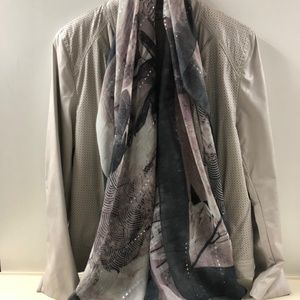Vintage Michael Jackson style with fake zipper. Choker collar look with snap button. Small zipper pockets on the sides. Color’s slight grey. Good quality. No description tag available. Size medium adjusted fit but could fit small also. Very light. Pet and smoke free environment