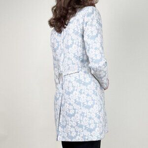Step into timeless style with this charming vintage coat, featuring a delicate pale blue and white floral jacquard knit pattern that adds a touch of classic elegance. This versatile blazer-style jacket is perfect for adding a chic, feminine layer to any outfit, from casual denim to a sophisticated dress