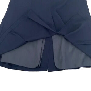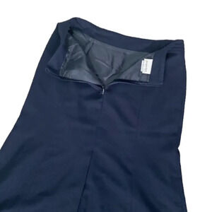 DESCRIPTION: A Vintage Elegant Maxi Skirt in a wool blend crepe feel material. Fully lined with a front and back slit giving it a dressy, dramatic twist. Detail design in the material at the hips. Navy blue. Zippered closure.