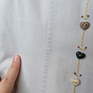 This vintage jacket has a unique touch with its heart buttons and embroidered accents. It's a versatile piece that can be dressed up or down.
