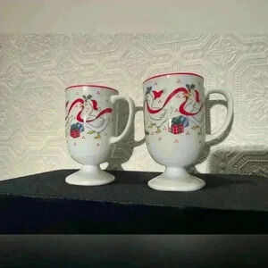 Vintage Japan Footed Christmas Tea Coffee Cups (2) Ducks Playing With Ribbon