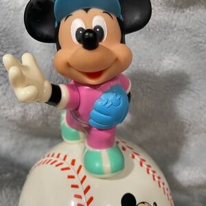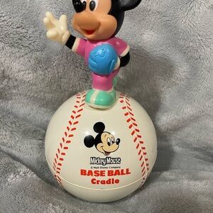 In original box. Mickey sits a top a baseball and it as it wobbles back and forth produces music like wind chimes. Japanese baby toy