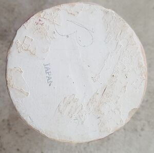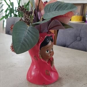 Midcentury modern Japanese paper mache head bust of girl in vibrant pink head covering is perfect for holding faux botanicals, makeup brushes, Q-tips, cotton balls, or whatever else you can think of.