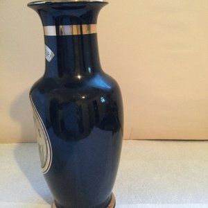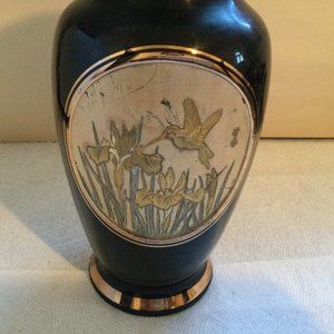 Vintage Japanese Chokin art 24k Gold vase black flower bird signed 10"