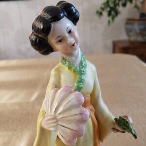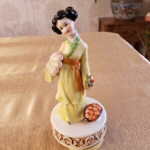 Vintage Japanese Geisha porcelain music box, 8 1/2" tall. Exceptional detailed work, the geisha is shown fanning herself and holding an apple with an apple basket at her feet. This beautiful porcelain figurine is hand-painted and made in Japan. It is in perfect condition, music box plays a Japanese song.