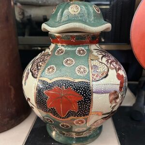 Vintage Japanese Green and white ceramic cookie jar vase with gold accents 13"
