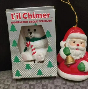 Vintage Jasco Lil Chimer Polar Bear & 1985 Santa Christmas Ornament Bell Bisque Porcelain