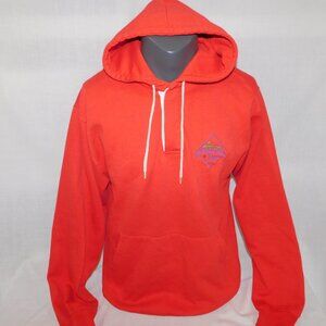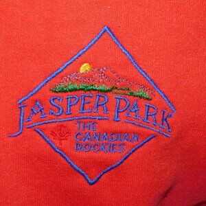 This Vintage Jasper Park The Canadian Rockies Adult XL Red 1/4 Button Hoodie is in great clean bright condition. Hoodie is 50% Cotton- 50% Polyester - Machine washable - Tumble Low. Features Embroidered JASPER PARK The Canadian Rockies image on front left chest. 1/4 Button up. Draw String Hood. Front Kangaroo Pocket