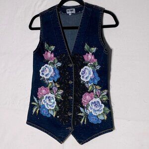 Vintage Jazzino Dark Wash Embroidered Beaded Button Up Denim Vest S