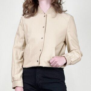 This elegant Jean Paul Gaultier bomber jacket in a sophisticated beige hue features a classic ribbed collar and cuffs, embodying timeless style. It boasts a clean, minimalist design with a snap-button front closure and two practical side pockets for functionality. This versatile piece offers a blend of comfort and chic, perfect for elevating any casual or semi-formal ensemble.