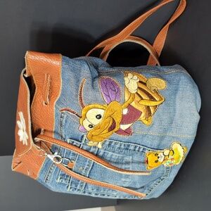 Vintage Jean/Faux Leather Medium Backpack with added Character Patches .