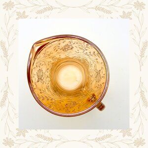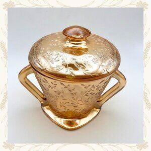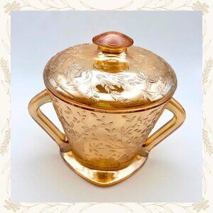Add a touch of golden elegance to your collection with this vintage Jeanette Glass set in the Floragold “Louisa” pattern. Featuring a delicate floral motif and warm amber hue, the set includes a graceful creamer and a lidded sugar bowl with ornate handles. This lustreware mid-century beauty is perfect for tea service or display and reflects the charm of Depression-era glassware.