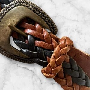 Vintage Braemar and Jeremy Scott design. This exquisite braided leather belt features a rich combination of dark and medium brown tones. It is adorned with a large circular metal buckle that adds a touch of sophistication. Perfect for enhancing your style, this belt is a versatile accessory for any occasion.