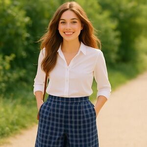 Vintage Jeremy Scott for Braemar Petites Plaid Pleated Shorts - Size 6 Rare vintage pleated shorts by Braemar Petites featuring a navy and white plaid pattern, designed by Jeremy Scott. Made in Canada, these structured high-waisted shorts have a timeless preppy aesthetic. Features side pockets, belt loops, and crisp front pleats for a polished fit. Size: Tagged 6 (see flat lay measurements to verify fit) Fabric: 65% Polyester, 35% Viscose Closure: Front zipper with button (button is missing) Condition: Excellent vintage condition, single button on waist is missing. Easy fix to sew any button on. Estimated Era: Late 1980s to early 1990s Cover/model photo(s) is for style inspo only, made with photos of item for sale & AI. It may or may not accurately represent item for sale. Please read the entire description & view all photos of actual item for sale. With purchasing this item, you agree to these terms May be minor wear I’ve missed though item inspected with care. Colours may differ from screen to screen. Smoke free pet friendly home. New to Posh? Use code SCENEONTV to sign up & get $15 off your first purchase! Follow me on IG @mama_laurelle Style Tags: Preppy Vintage Plaid Shorts Jeremy Scott Vintage Cottagecore Academic Style Made In Canada