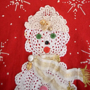 Crafted from high-quality materials, this sweater features a vibrant red hue that instantly catches the eye. The intricate detailing of snowmen, lace accents, buttons, and snowflakes adds a whimsical touch, making it a standout choice for any holiday gathering or festive occasion.