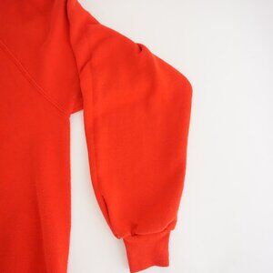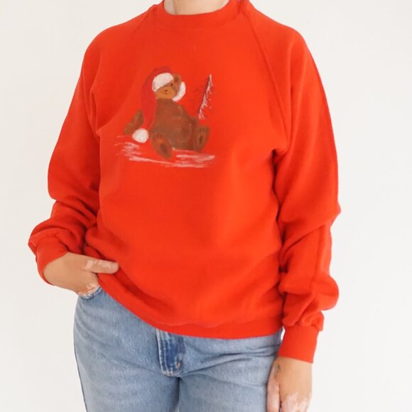 This Vintage Jerzees Christmas sweatshirt brings pure Festive joy with its bright red colour and charming hand-painted teddy bear dressed in a Santa hat. The snowy details and soft brushstroke style give it that nostalgic, heartwarming feel people love in classic holiday graphics. It’s the kind of piece that instantly lifts the mood, perfect for cookie decorating, cozy movie nights, or any cheerful December outing where you want something playful and spirited.