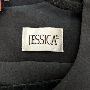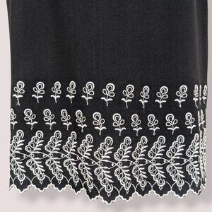 This sleeveless vintage dress by Jessica is made of a rayon/polyester/elastane blend (55/41/5) and is black with intricate white floral embroidery at the bottom. The dress has a round neckline, a back zip and hook & eye, and darting in the front and back for fit. There is normal wear, but no issues affecting wearability.