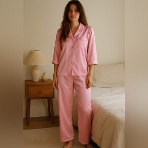 Slip into retro glam with this vintage Jessica Intimates pajama set in a glossy bubblegum pink satin. Includes a button-front top with notch collar, chest pocket, and 3/4 cuffed sleeves, paired with matching straight-leg pants featuring an elastic waistband for comfort. A charming 1980s/1990s lounge look.
