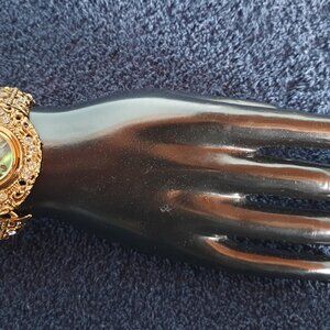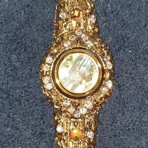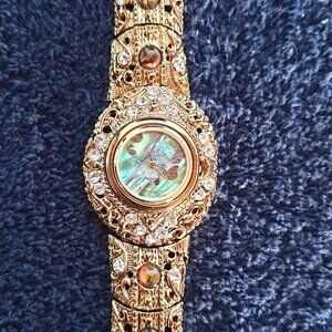 Vintage Jeweled Abalone Rhinestone & Tiger Eye Gold-Plated Japan Quartz Watch