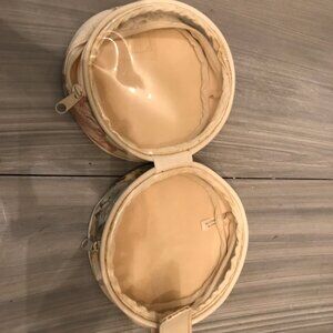 Two compartments each with a zipper closure and a see through top. The compartments fit one on top of the other and have a velcro closure. Soft vinyl material in a beige and pink floral design. Six inches in diameter.