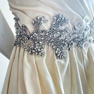 The ivory silk material is accentuated with beautiful beading and crystal/diamante detailing, making it a truly special piece.
