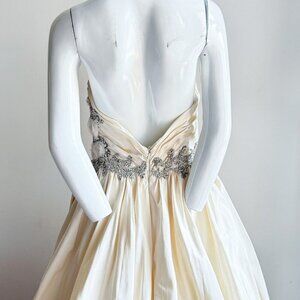Lots of layers and full crinoline in skirt. Boned bodice. Beautiful beading and applique detail.