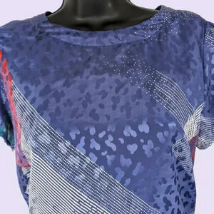 This wild vintage dress by Jo Hanna York is a relic of a bygone era! Featuring a low elastic waist and a pleated skirt, this short sleeve dress is an attention-getter. It has one two-button closure at the back of the neck and one on the left hip. The pattern of the fabric appears to feature animal print and feathers in a shiny, abstract arrangement. This dress is a lot of things, and dull isn't one!