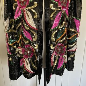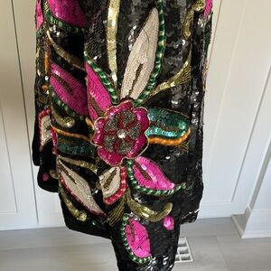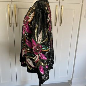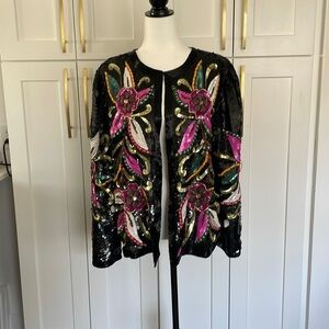 Vintage Joan Leslie Evenings sequinned/beaded bolero jacket. Entirely sequinned and beaded long sleeve bolero jacket with multicoloured floral pattern, gold piping detail and threaded detail, one hook and eye clasp closure at the top of the jacket. The colours and pattern make this vintage piece look contemporary and stylish. This amazing jacket is heavy due to being completely sequinned and beaded, polyester/silk lining, NO shoulder padding, the label, size tag and material tag has been cut out so please pay attention to the measurements provided. This is a vintage piece and does have some flaws. Some areas missing beading and sequins and most likely will have some continue to fall off here and there. Some of the gold piping around the flowers is lifted. Fit is large/extra large. Looks great open or closed, dressed up or down. Elevate your look with this unique show stopper! Please see photos, measurements are for reference only. Reasonable offers welcome!